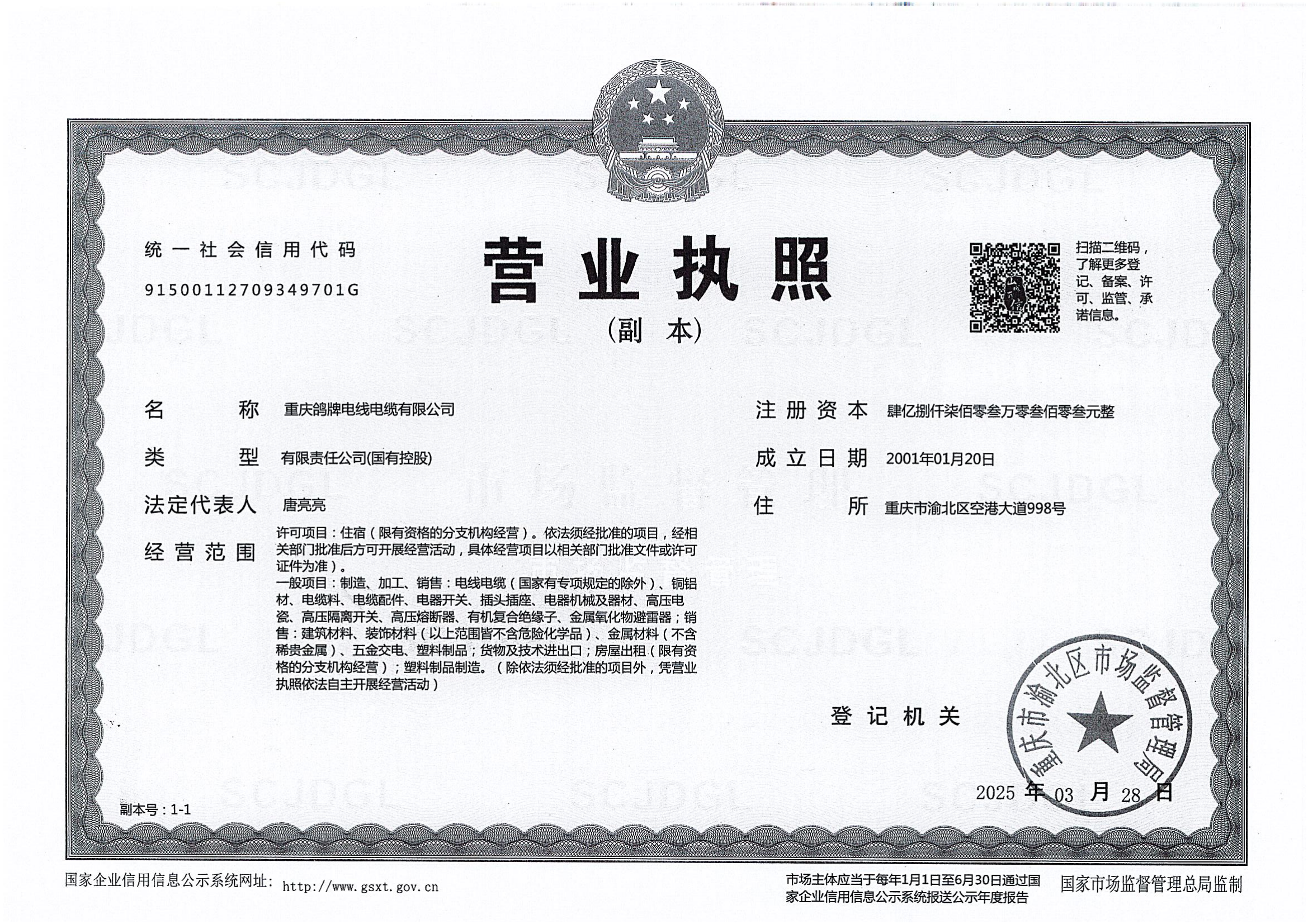 公司下設(shè)線纜廠、銅材廠兩個生產(chǎn)廠,并設(shè)有重慶鴿牌電瓷有限公司、重慶鴿牌電工材料有限公司兩家子公司。公司已成為中國西部家裝電線、特種電纜、銅型材、高壓電瓷產(chǎn)品的主要生產(chǎn)基地。